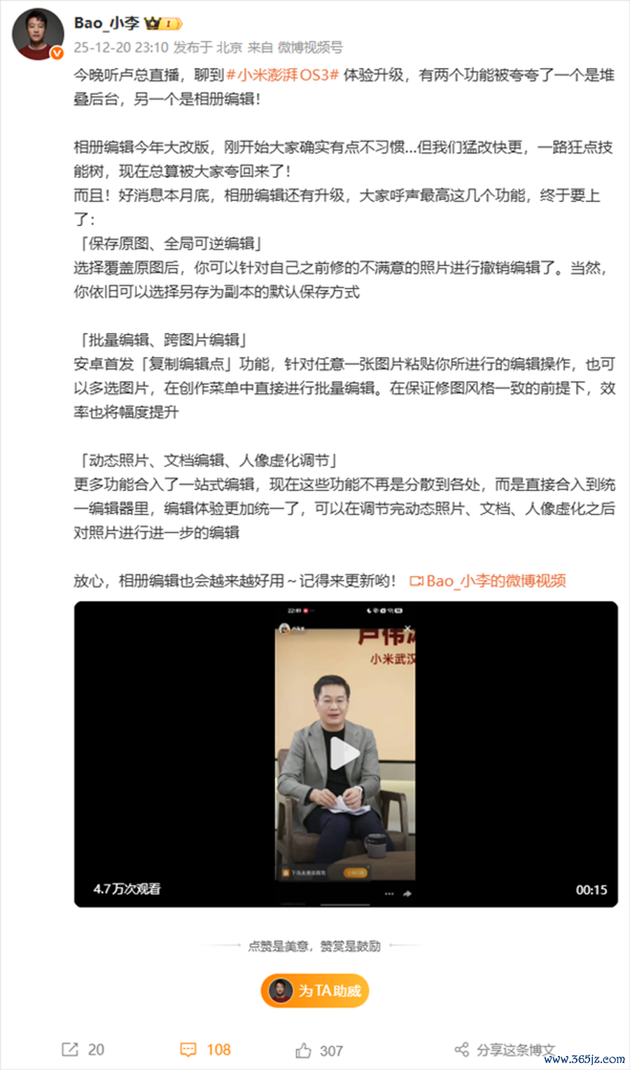 近日,小米相机部的居品司理“Bao_小李”通知,小米手机相册裁剪将于本月底迎来一轮热切升级。这次更新将引入用户们期待已久的多项新功能,旨在晋升用户的裁剪体验。